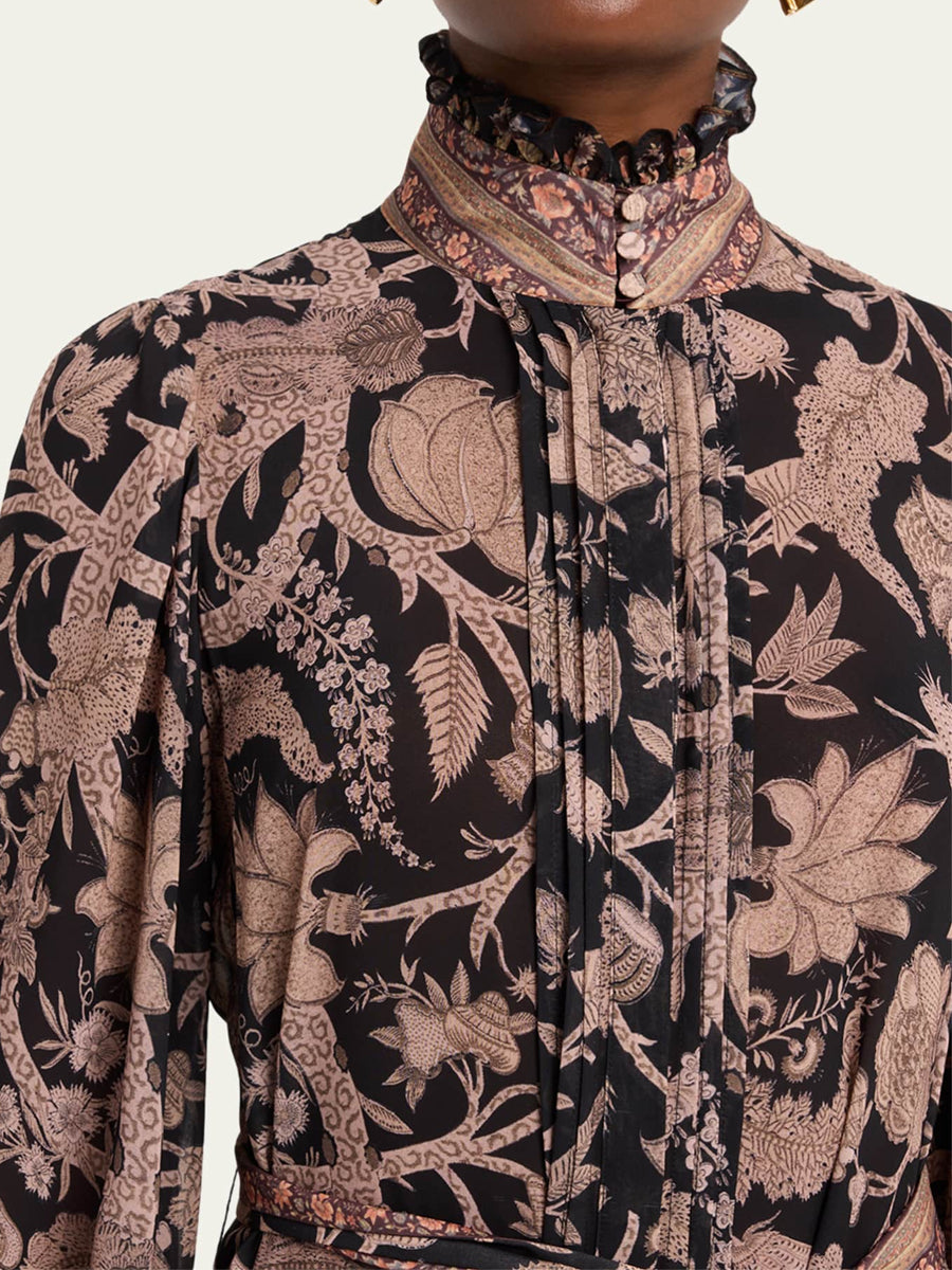 High Collar Floral-Print Balloon Sleeves Midi Dress