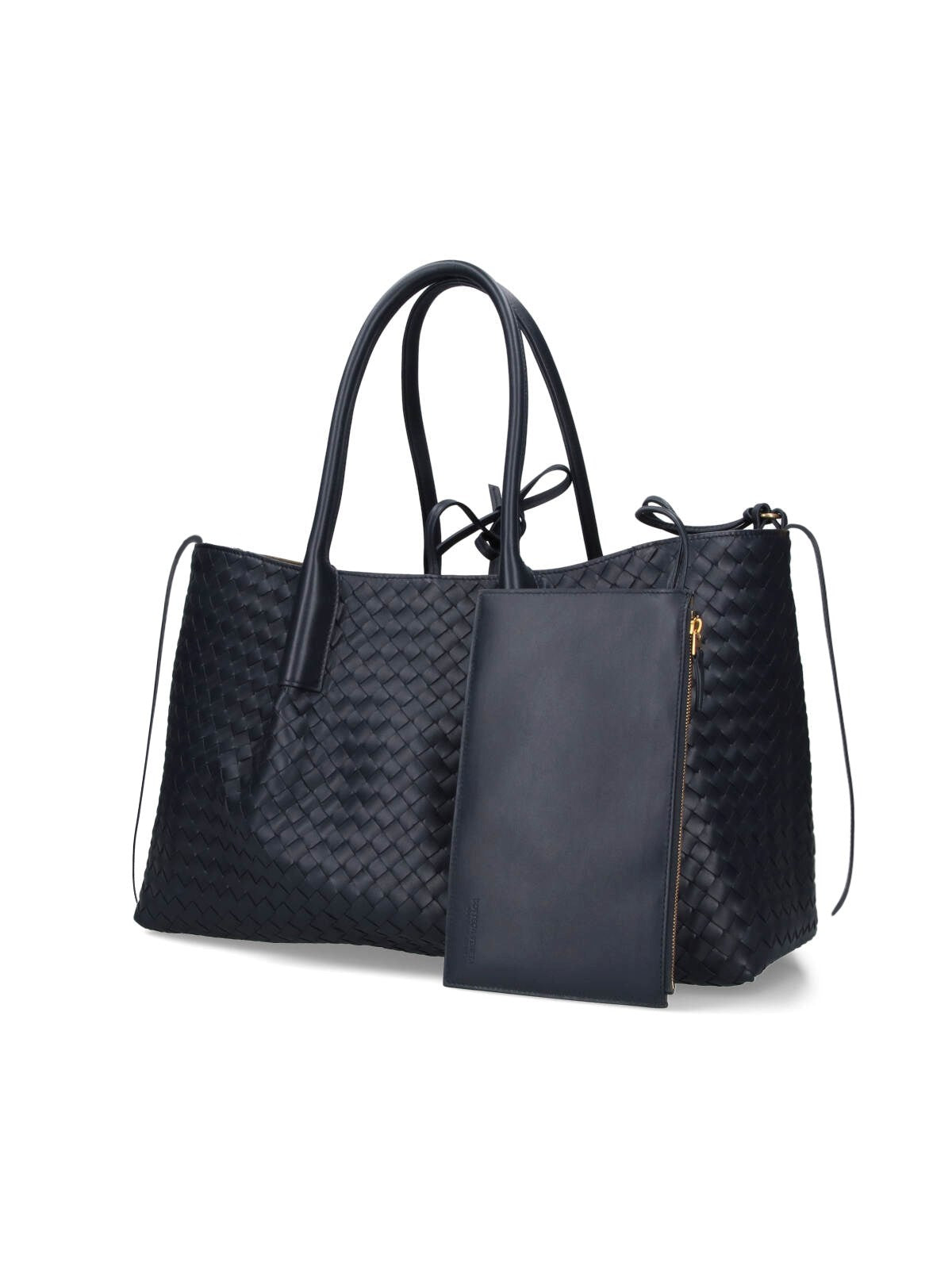Reversible bag in navy blue calf leather with two handles, adjustable and removable shoulder strap, lace-up closure, removable inner zip pouch, main inner compartment.