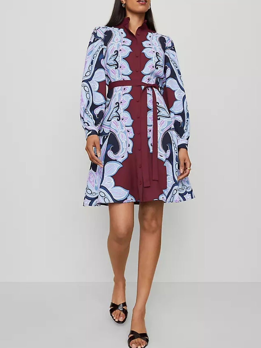 Pretty ruffles and puffled sleeves frame this feminine and romantic dress. Stand collar. Front button closures. Short puff sleeves with button cuffs. Tie waist. Lined.